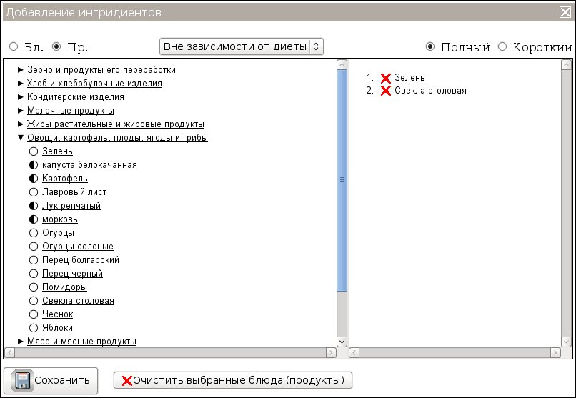 а справа - уже выбранные ингридиенты. Выбираются продукты простым щелчком по наименованию. Если ингридиент выбран