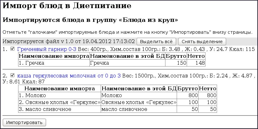 Просмотрев список импортируемых блюд Вы должны поставить "галочки" перед теми блюдами, которые желаете