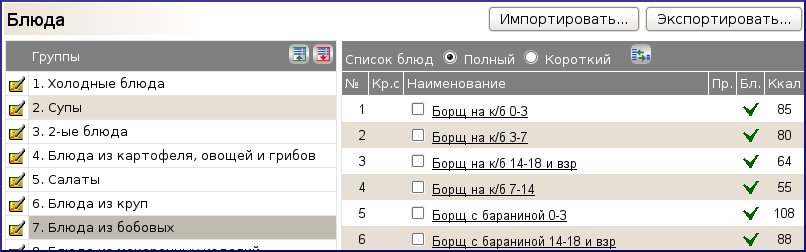 блюд: «Борщ к/б 0-3», «Борщ к/б 3-7», «Борщ к/б 14-18 взр»...