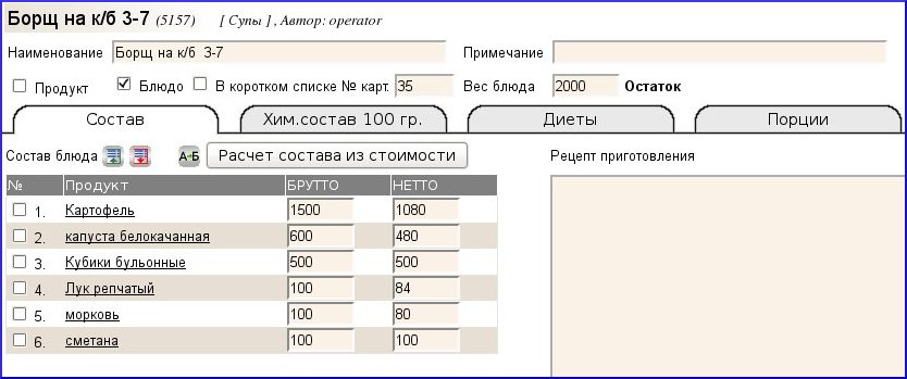 Сейчас на рисунке Вы видите состав блюда «Борщ на к/б 3-7» (что означает Борщ на костном бульоне