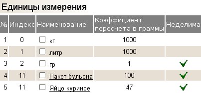 Первые 3 единицы измерения "кг" (килограмм), "л" (литр), "гр" (грамм) являются обязательными, они не редактируются и не удаляются. "Яйцо куриное" также необходимая единица измерения, и хотя она может быть Вами отредактирована, не советуем это делать, т.к. вес 47 грамм для яйца был взят из справочника продуктов И.М.Скурихина, который является признанным стандартом в этой области. Чаще всего этих единиц измерения достаточно для функционирования программы.
