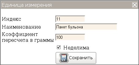 Для редактирования единицы измерения щелкните по наименованию, (например Пакет бульона), на экране откроется окно «Единица измерения»: Заполните поля необходимыми значениями и нажмите на кнопку «Сохранить».